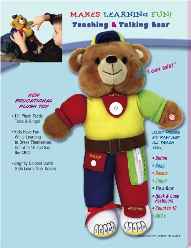 Make learning fun with The Teaching & Talking Bear. Just press the bear's paw and he will teach your child the ABCs and how to count to 10. Kids will have fun while learning to dress them themselves, using words such as button, snap, buckle, and zipper. Bear will also teach them how to tie a bow. The Teaching & Talking Bear is an educational plush toy that comes in a brightly colored outfit so kids can learn their colors too.