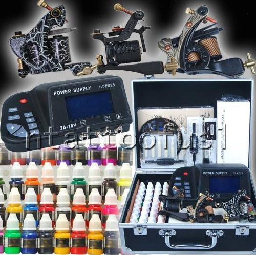 Professional 3 Tattoo Gun, Details: 1/ A set of 40 color inks(8ml/bottle) 2/ A set of Top power supply :VOLTS,CPS and DUTY show The power switch and controller are in the serface of machine,easy to operated Multiple button fast to adjust voltage Power suppply can be adjusted between 220V and 110V Output: 1.5V - 18V, 2 AMP Operating instructions 1. Turn on the power switch, click MENU "MENU", keyboard, will appear 1}Normal 2}Maintained 1) Normal stands for feet can control the tattoo machine 2) Maintained stands for keeping foot automatic control tattoo machine {no trample feet machine will be running as also} DISPLAY + / - - showed up CONTROL -- FOOTSWITCH pedal CONTROL Click "MENU" button to exit the MENU "+" and "-" button is used to regulate voltage Volts 1-2-3-4 four buttons 1=2V 2=4V 3=6V 4=8V EASY CONTROLLING This tattoo power supply including: 1 superior high quality power supply?fit your country voltage? 1 Power supply plug (fit your country cord plug) 1 free footswitch 1 free clip cord 3/ 3 pcs new Design professional tattoo machines Shader and Liner. 4/ 50 pre made sterile tattoo needles.(3,5,7,9RL)x5,(5,7,9RS)x5,(5,7,9Magnums)x5. 5/ 3 pc High quality alloy Tattoo Machine Grips with 1 stainless-steel back-stems. 6/ 2 pc High quality disaposible grips(25mm). 7/ A pairs of disposable gloves. 8/ 1 sheets practice skin. 1 sheet of transfer paper. 9/ 50 tattoo-machine rubber bands 50 mixed-color grommets 50 rubber o-rings 1 Set of adjust tools and other attachments. 10/1 Pack of A & D Ointment. Each pack is a 5 gram foil pack. 11/ 20 disposable tips. 12/ CD: One CD These will help you be able to offer the perfect designs to your customers. Comes in a data DVD format and sure to have plenty of designs to meet even your most discriminating customer's tastes! 13/ 100 Ink cups and 1 Ink cup holder . 14/ Great quality black colored carrying case with lock & keys, it looks fine.
